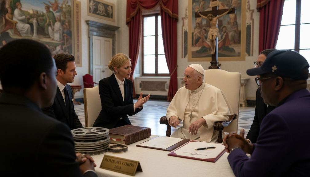 In conclusion, the intersection of Hollywood elite and Pope Leo at the Vatican symbolizes a unique opportunity to bridge cultural divides and promote conservative values in a global context. By engaging in meaningful dialogue that respects differing perspectives while upholding core principles of personal accountability, family values, and moral integrity, these interactions can lead to a richer and more inclusive cultural exchange. It’s a reminder of the enduring relevance of traditional values in a rapidly changing world, emphasizing the importance of upholding timeless virtues in the face of shifting cultural landscapes.