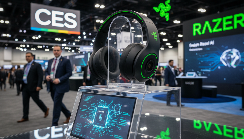 Razer presented a new concept AI wearable at CES resembling wireless headphones with integrated camera lenses in the ear cups. The Project Motoko device is powered by a Qualcomm Snapdragon chip and features dual first-person-view cameras at eye level.