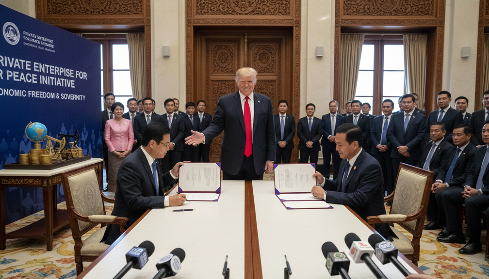 President Trump attends a ceremony where Thailand and Cambodia sign a ceasefire agreement, highlighting the power of private enterprise in conflict resolution. This event underscores the importance of entrepreneurship and cooperation in fostering peace and stability, showcasing the benefits of economic freedom and national sovereignty.