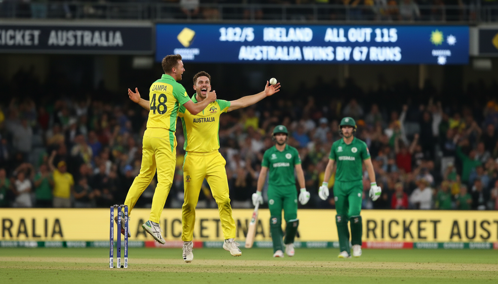 Australia’s T20 World Cup campaign got off to a flying start as they crushed Ireland by 67 runs in their opening match, despite the setback of losing skipper Mitch Marsh to injury just before the game. The victory was a testament to the depth and resilience of the Australian squad, with standout performances from Adam Zampa and Nathan Ellis leading the charge. Zampa showcased his spin wizardry by picking up three crucial wickets, while Ellis impressed with his pace and accuracy, also claiming three scalps to dismantle the Irish batting lineup.